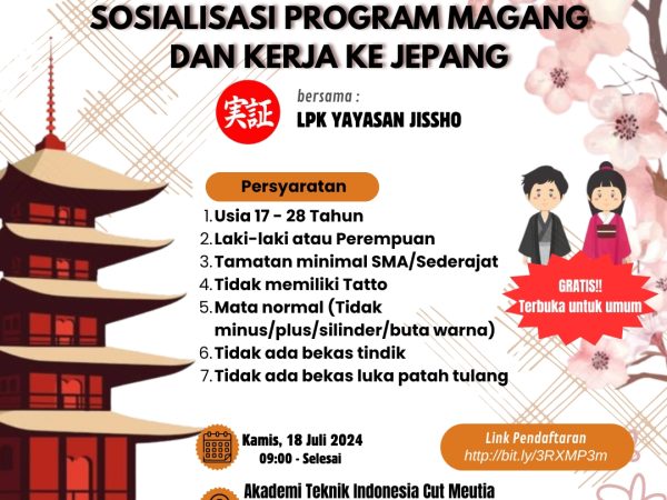 ATI Cut Meutia akan mengadakan sosialisasi Program Magang dan Kerja ke Jepang yang akan diadakan Hari Kamis Tanggal 18 Juli 2024,